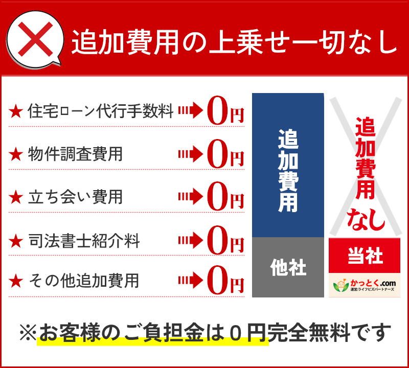 もちろん仲介手数料以外の追加費用も一切なし!住宅ローンの代行手数料や司法書士紹介料といった、「それっぽい費用」の請求もいたしません。