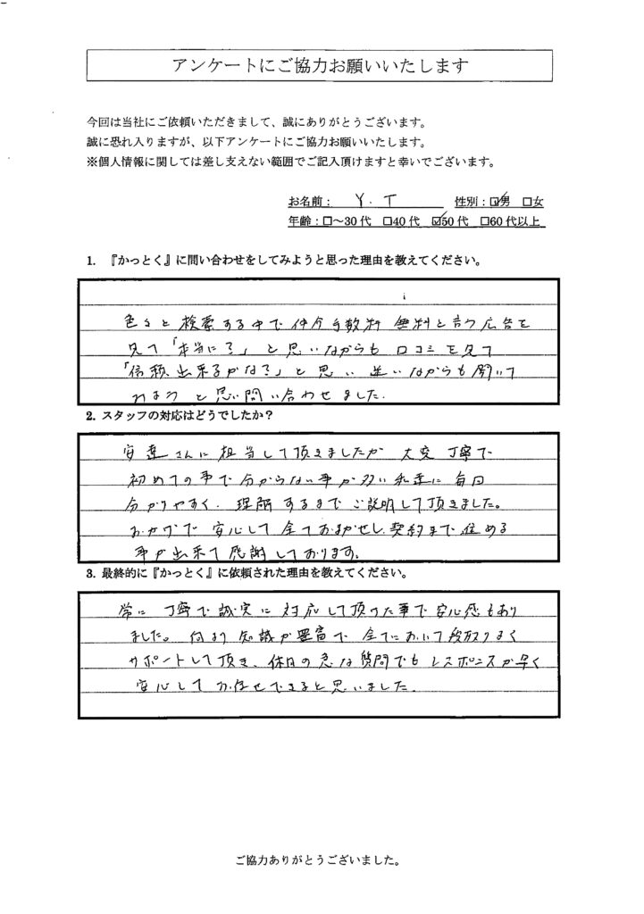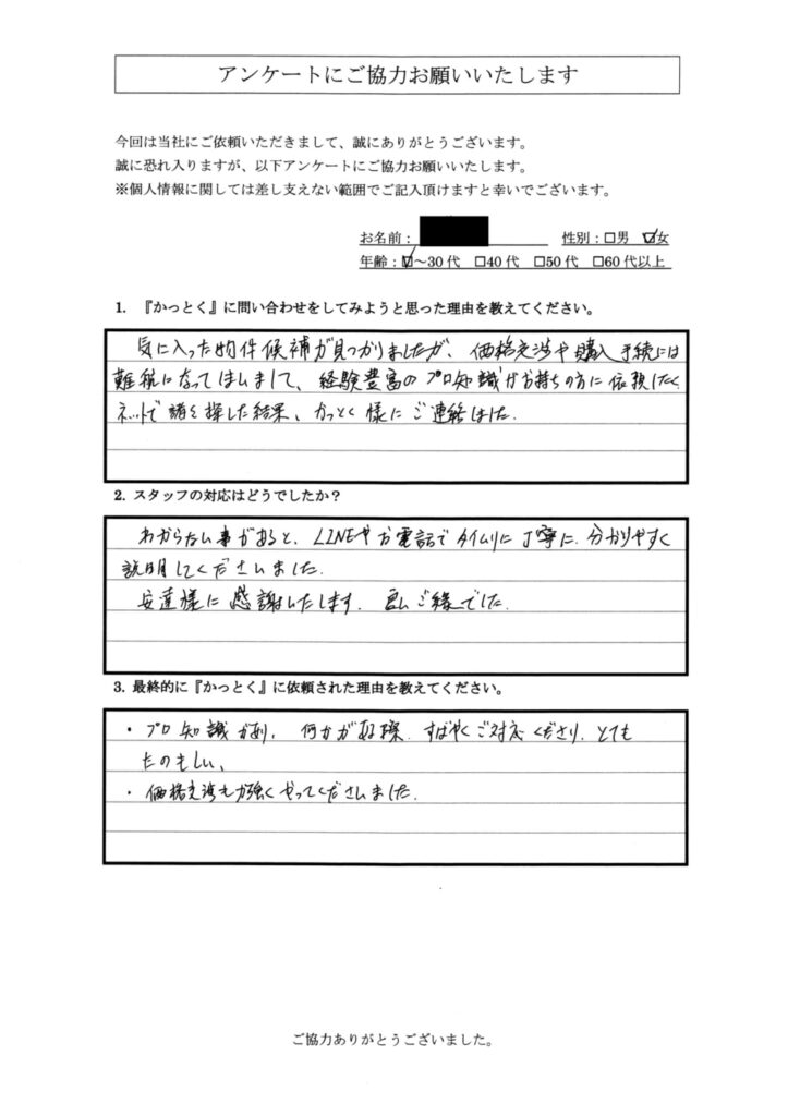 - A:最初から最後までとても丁寧で手続き等の連絡もまめにもらっており大変満足しています。