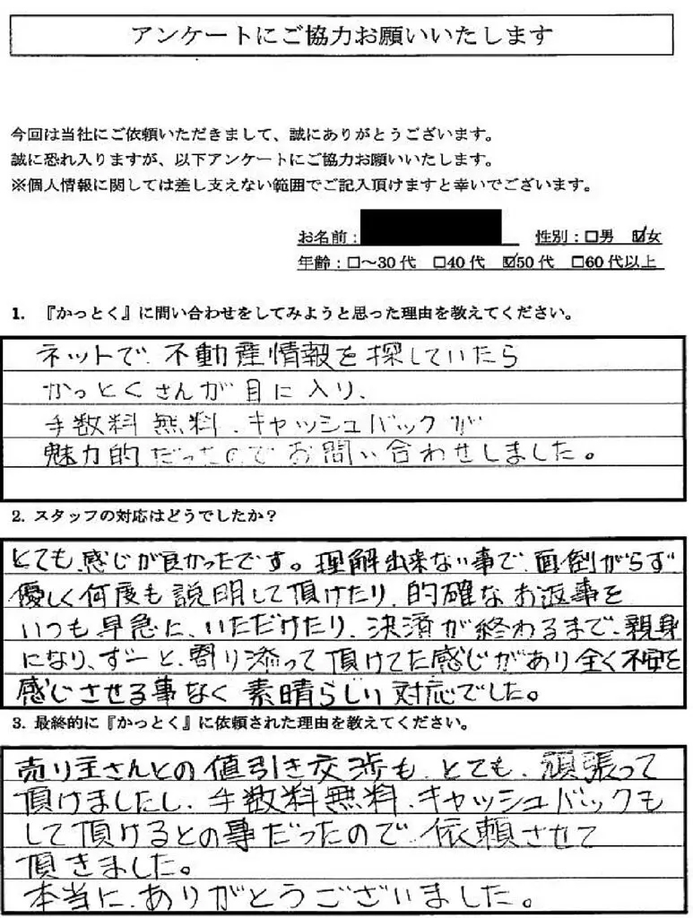 - A:売主さんとの値引き交渉も、とても頑張っていただけましたし、手数料無料、キャッシュバックもして頂けるとの事だったので依頼させていただきました。