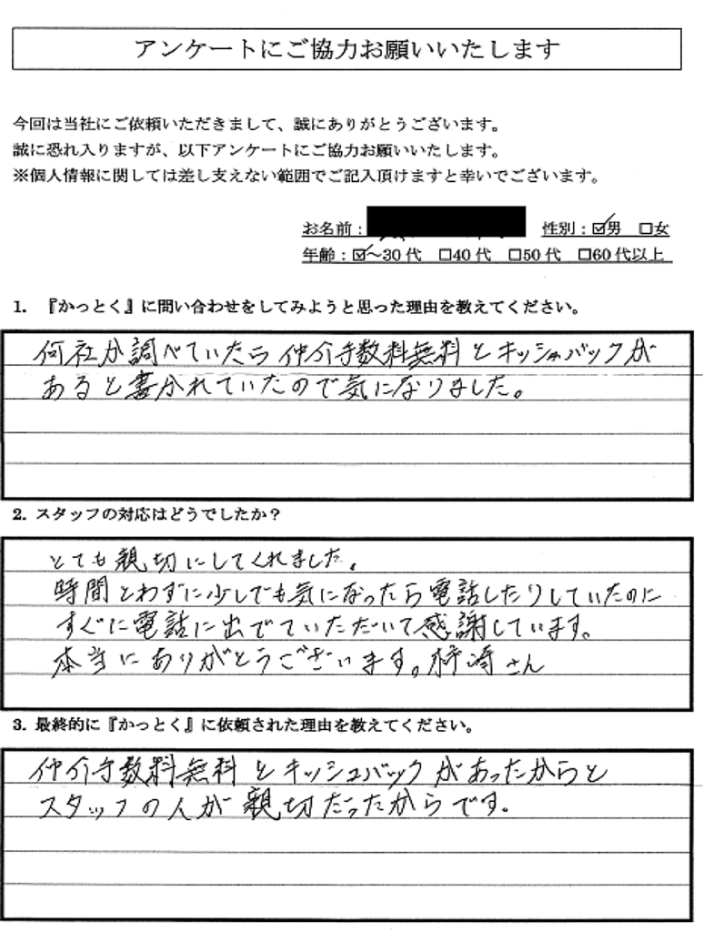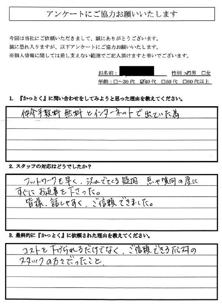 理解できないことで、面倒がらず優しく何度も説明して頂けたり、的確な返事をいつも早急に、いただけたり、決済が終わるまで。親身になり、ずーと寄り添って頂けてた感じあり全く不安を感じさせる事なく素晴らしい対応でした。 - Q3:最終的に『かっとく』に依頼された理由を教えてください。