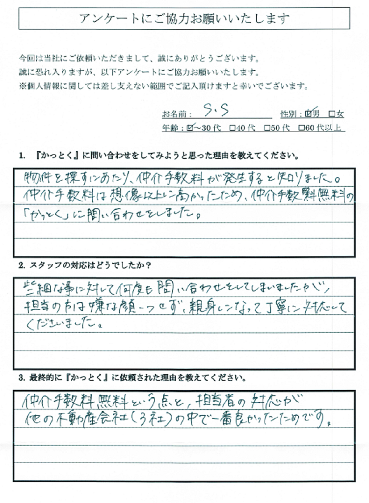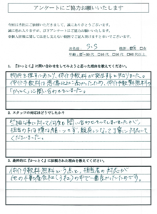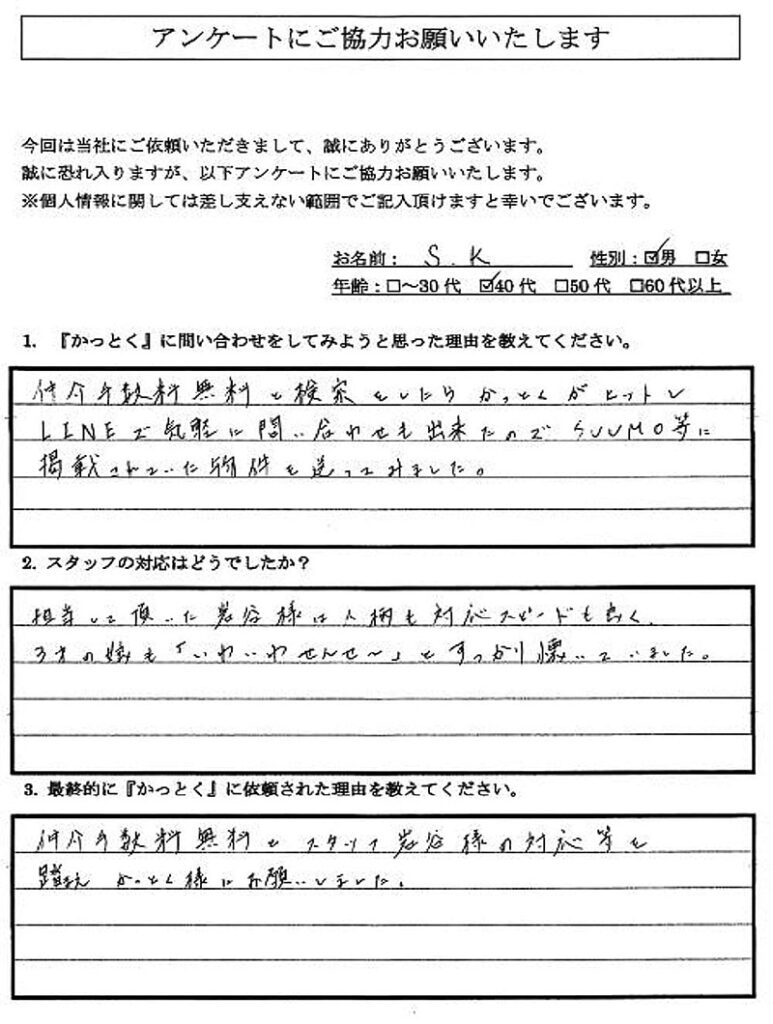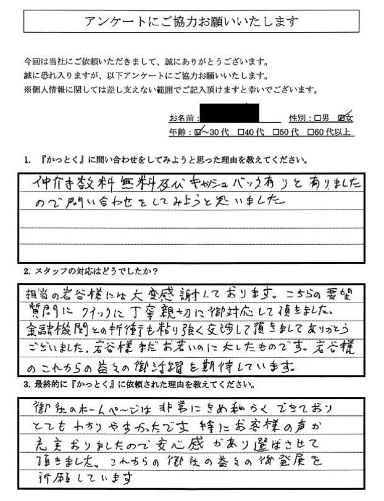 物腰が柔らかいのも遠慮なく話せたので良かったです。 - Q3:最終的に『かっとく』に依頼された理由を教えてください。