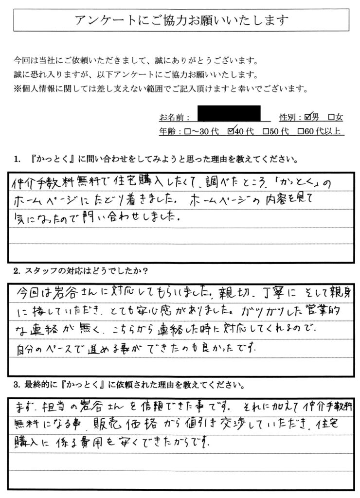 ガツガツした営業的な連絡が無く、こちらから連絡した時に対応してくれるので、自分のペースで進める事ができました。担当の岩谷さんを信頼できた事、仲介手数料無料になる事、販売価格から値引き交渉していただき、住宅購入にかかる費用を安くできました。