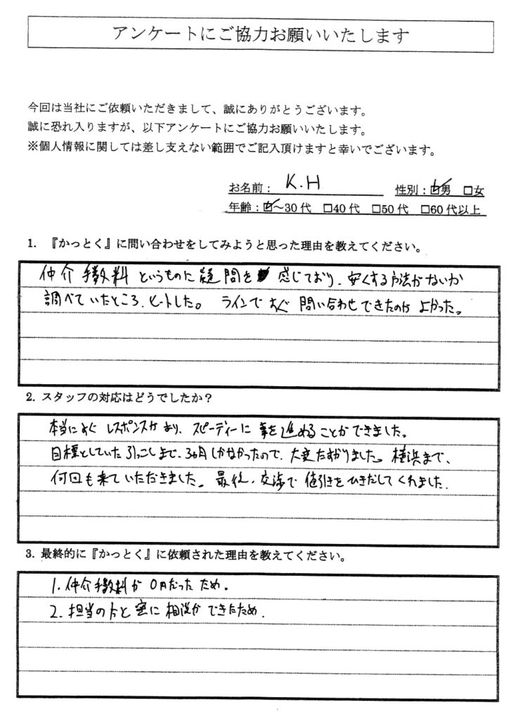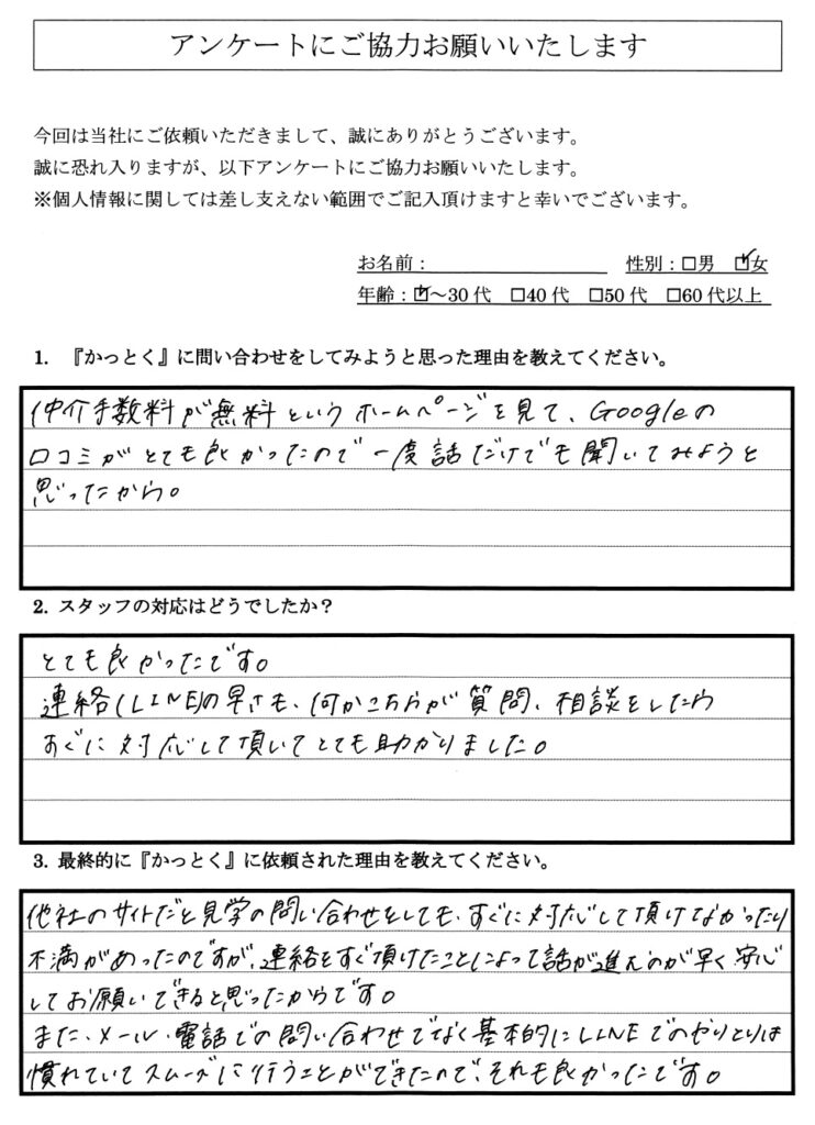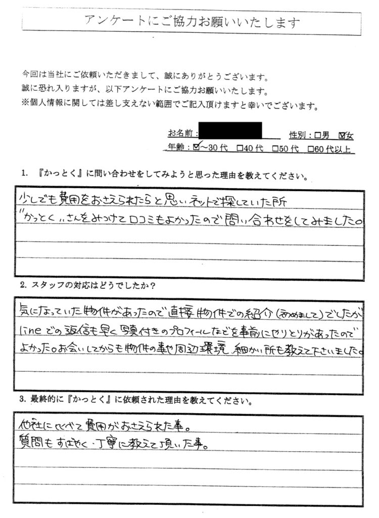 ガツガツした営業的な連絡が無く、こちらから連絡した時に対応してくれるので、自分のペースで進める事ができたのも良かったです。 - Q3:最終的に『かっとく』に依頼された理由を教えてください。