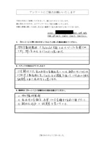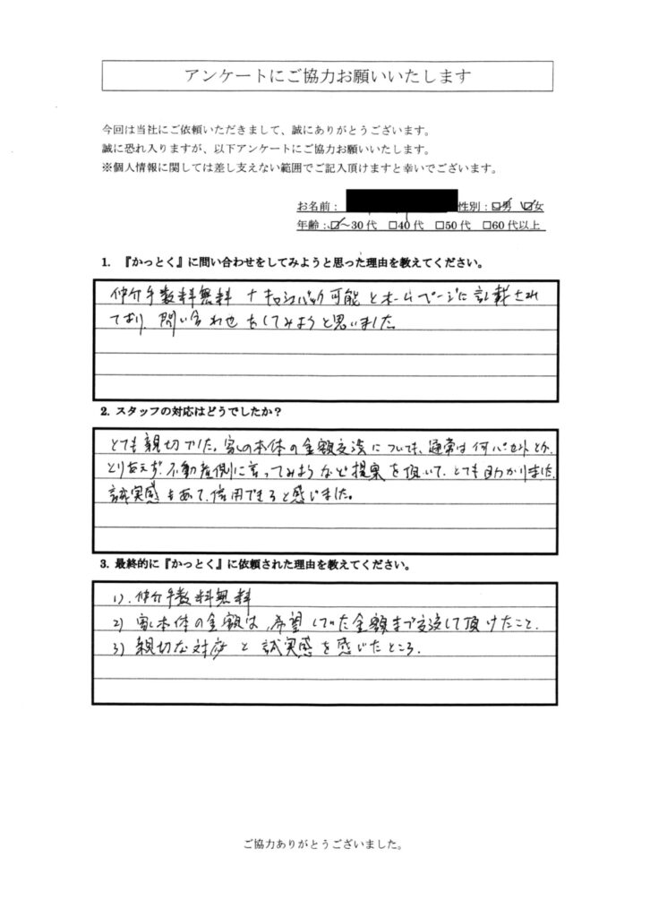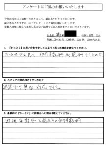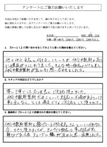 (妻からです⇒)親切、丁寧に説明して下さる等、たくさんフォローして頂きましてありがとうございました。柿崎さんのご健康と益々のご活躍を祈念いたします。 - Q3:最終的に『かっとく』に依頼された理由を教えてください。