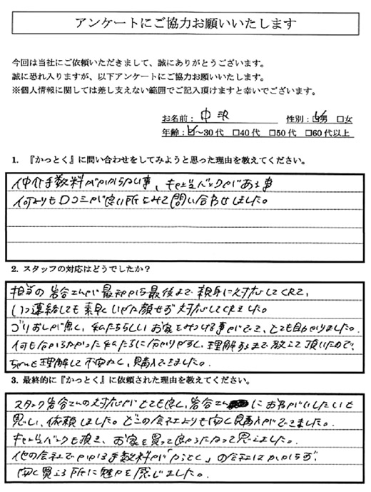 何も分からなかった私たちにわかり易く、理解するまで教えて頂いたので、ちゃんと理解して不安なく、購入できました。 - Q3:最終的に『かっとく』に依頼された理由を教えてください。