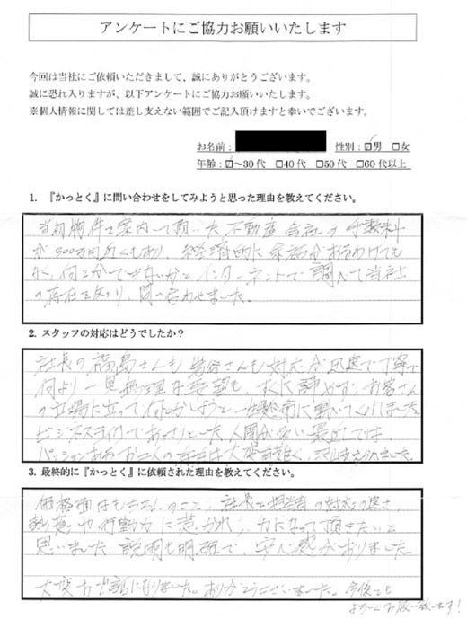 お客様にも色々とご協力いただきましたおかげで、タイトな日程の中スムーズに物件のお引渡しが出来ました。