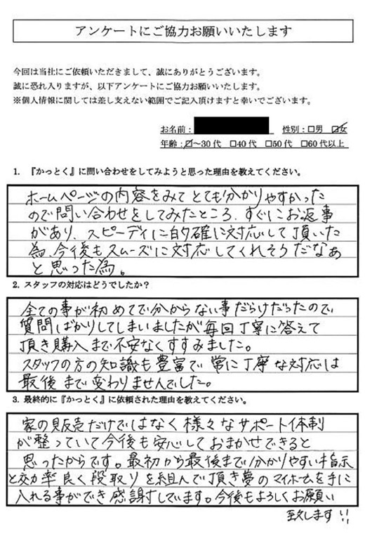 スタッフの方の知識も豊富で、常に丁寧な対応は最後まで変わりませんでした。 - Q3:最終的に『かっとく』に依頼された理由を教えてください。