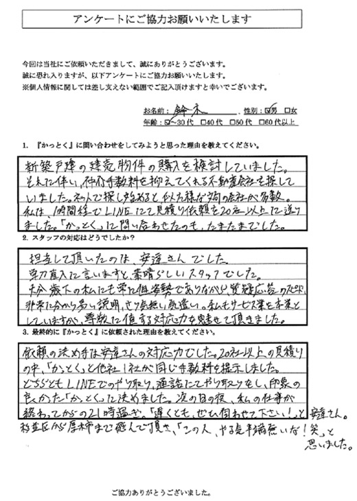 A:以来の決め手は安達さんの対応力でした。20社以上の見積りの中『かっとく』と他社1社が同じ手数料を提示しました。