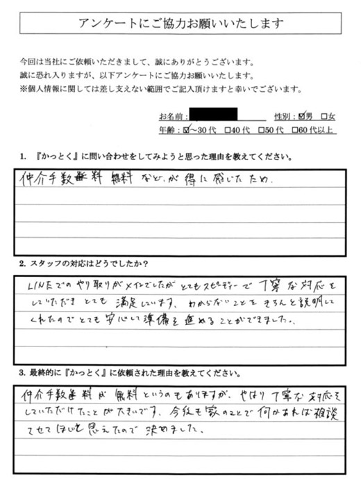 わからないこともきちんと説明してくれたのでとても安心して準備を進めることができました。 - Q3:最終的に『かっとく』に依頼された理由を教えてください。