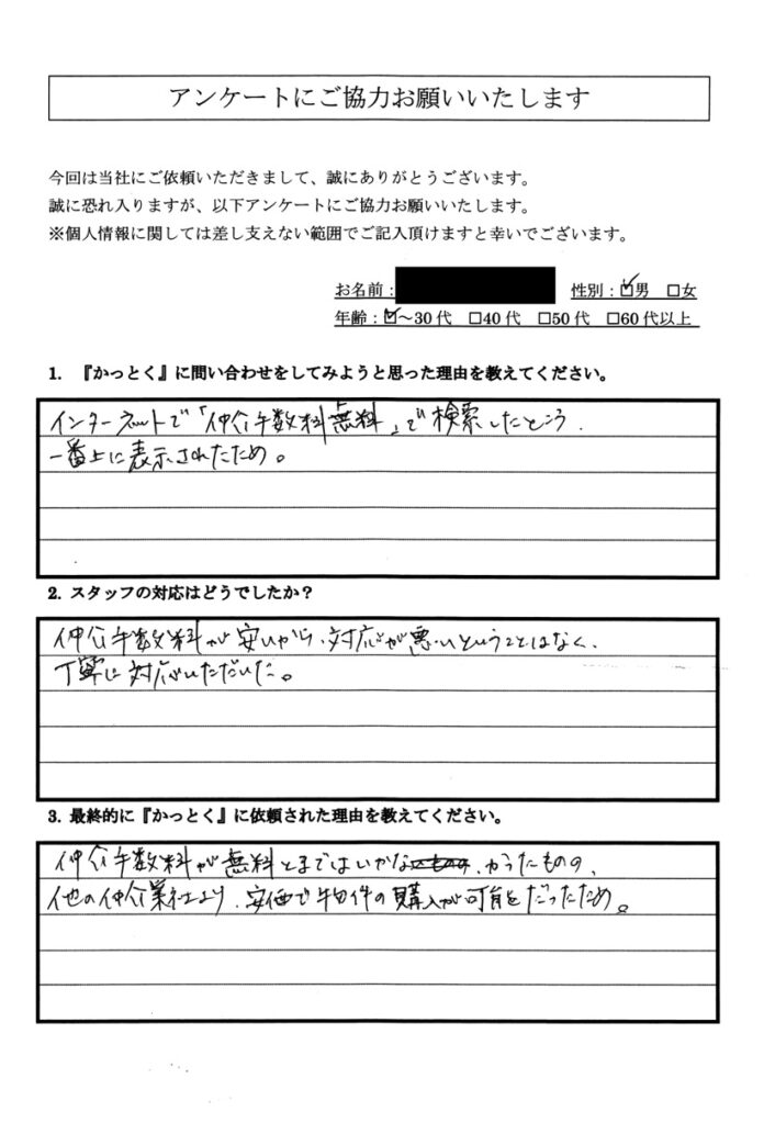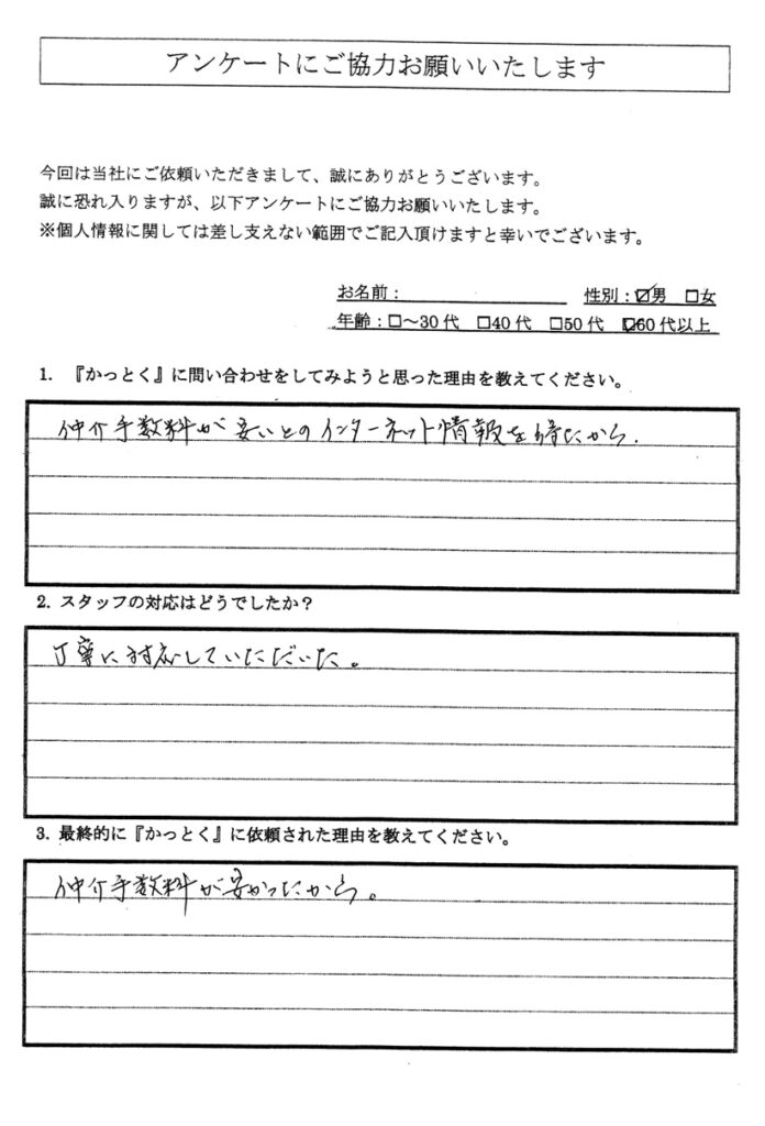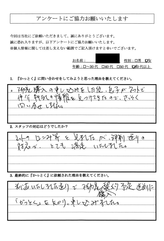 先回りしてテキパキとこなされるので金融機関の方も、感心しておられました。 - Q3:最終的に『かっとく』に依頼された理由を教えてください。