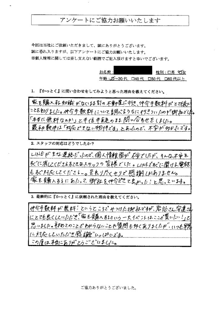 仲介手数料が無料!という所で見つけた御社ですが、岩谷さん、安達さんにとてもよくして頂き、「家を購入するという一大イベントはここで買いたい!」と思いました。初めてのことで分からない事や質問も多くありましたが、いつも早急に対応して頂き感謝でいっぱいです。