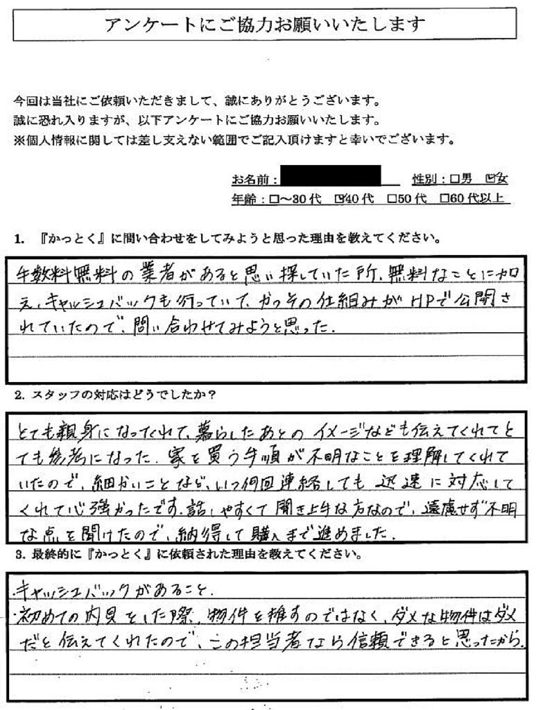 本当に顧客のことを考え、行動して下さるので、今後家をご購入する方には「かっとく」にお願いすることを強く勧めたいです!!