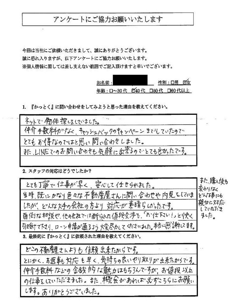 ご契約からお引渡しまで短いお時間でしたが、お引渡しまでスムーズに行えましたことに大変感謝しております。