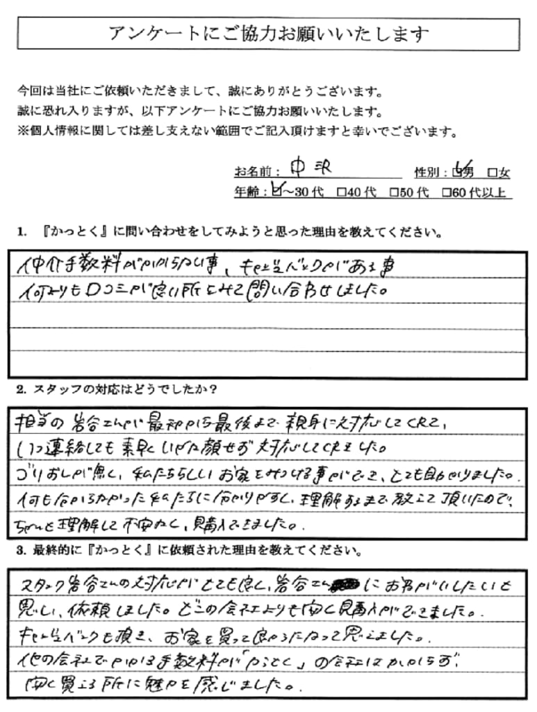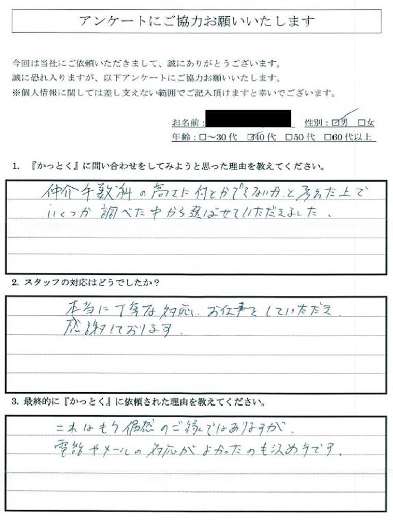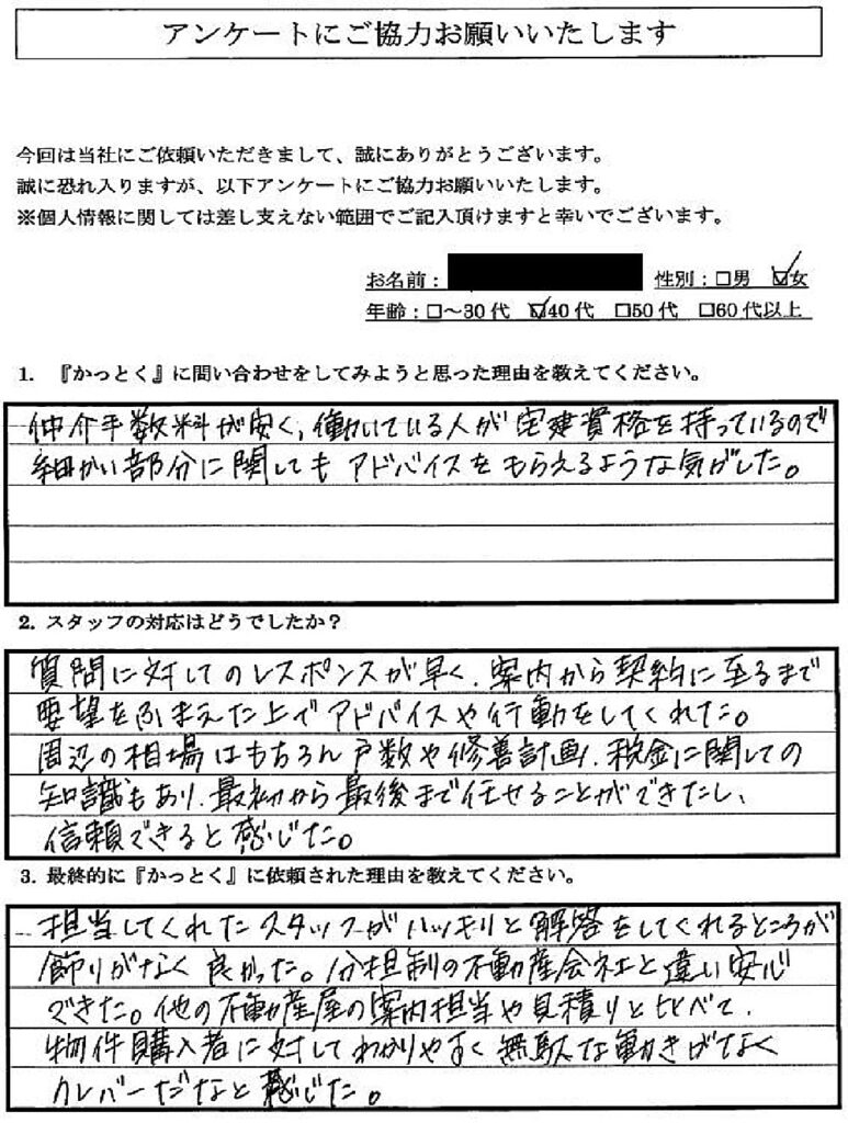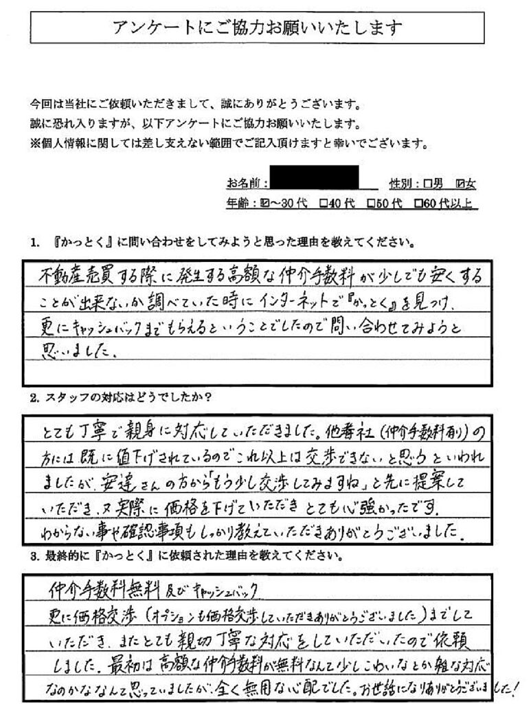 - A:仲介手数料の高さに何とかできないかと考えた上でいくつか調べた中から選ばせて頂きました。