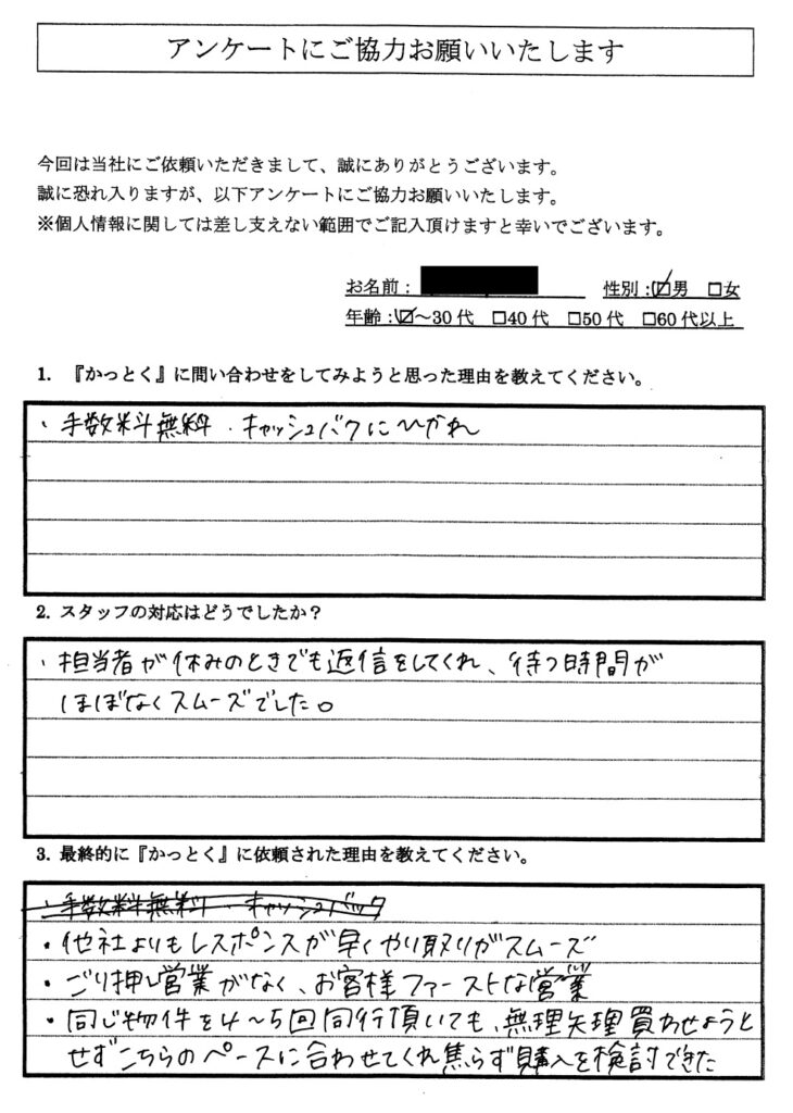 同じ物件を4~5回同行頂いても、無理やり買わせようとせずこちらのペースに合わせてくれ焦らず購入を検討できた。