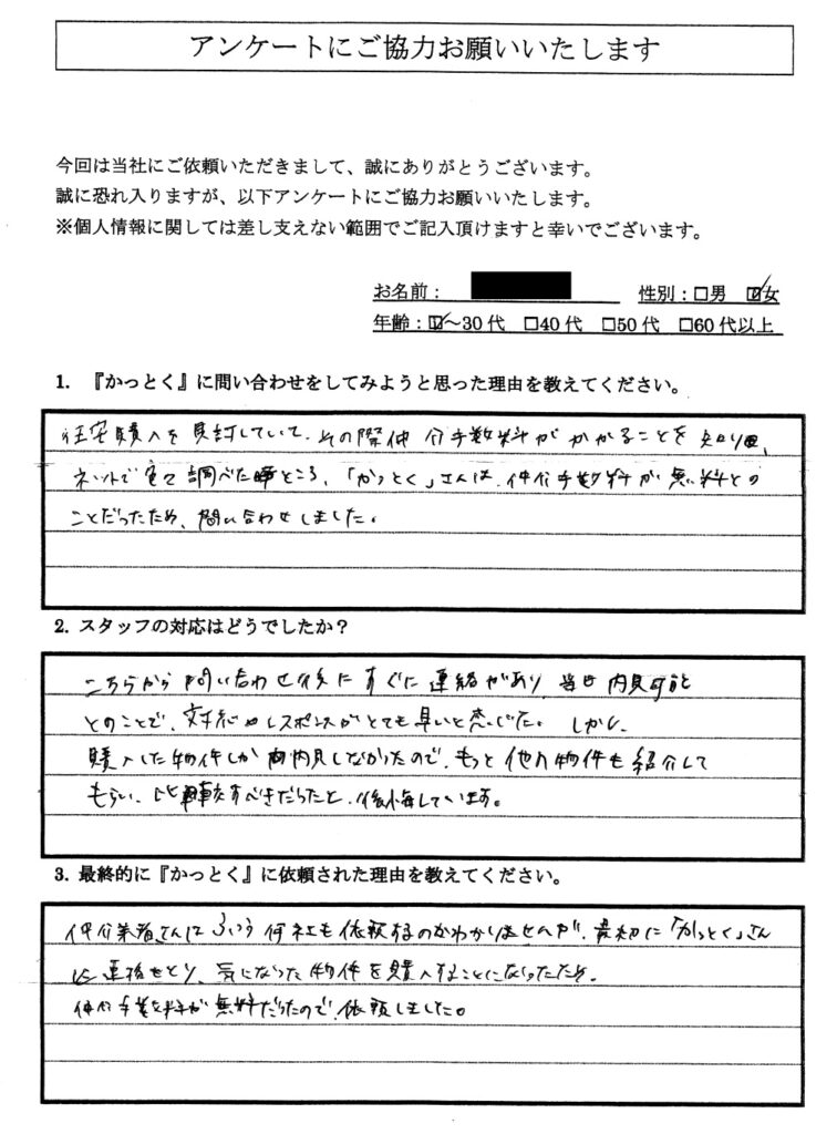 ・同じ物件を4~5回同行頂いても、無理やり買わせようとせずこちらのペースに合わせてくれ焦らず購入を検討できた