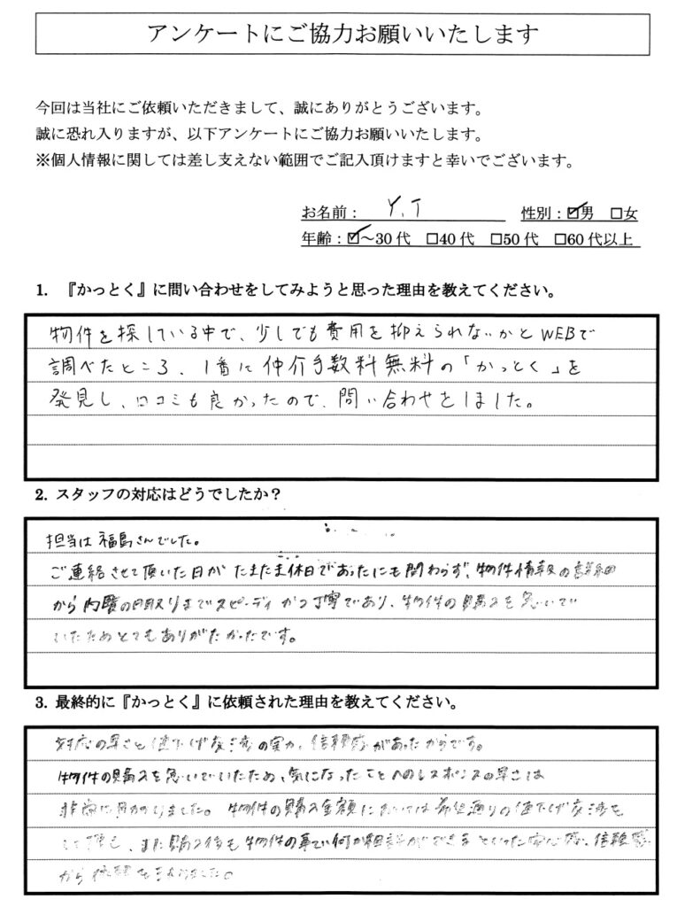 お会いしてからも物件の事や周辺環境、細かい所も教えて下さいました。 - Q3:最終的に『かっとく』に依頼された理由を教えてください。